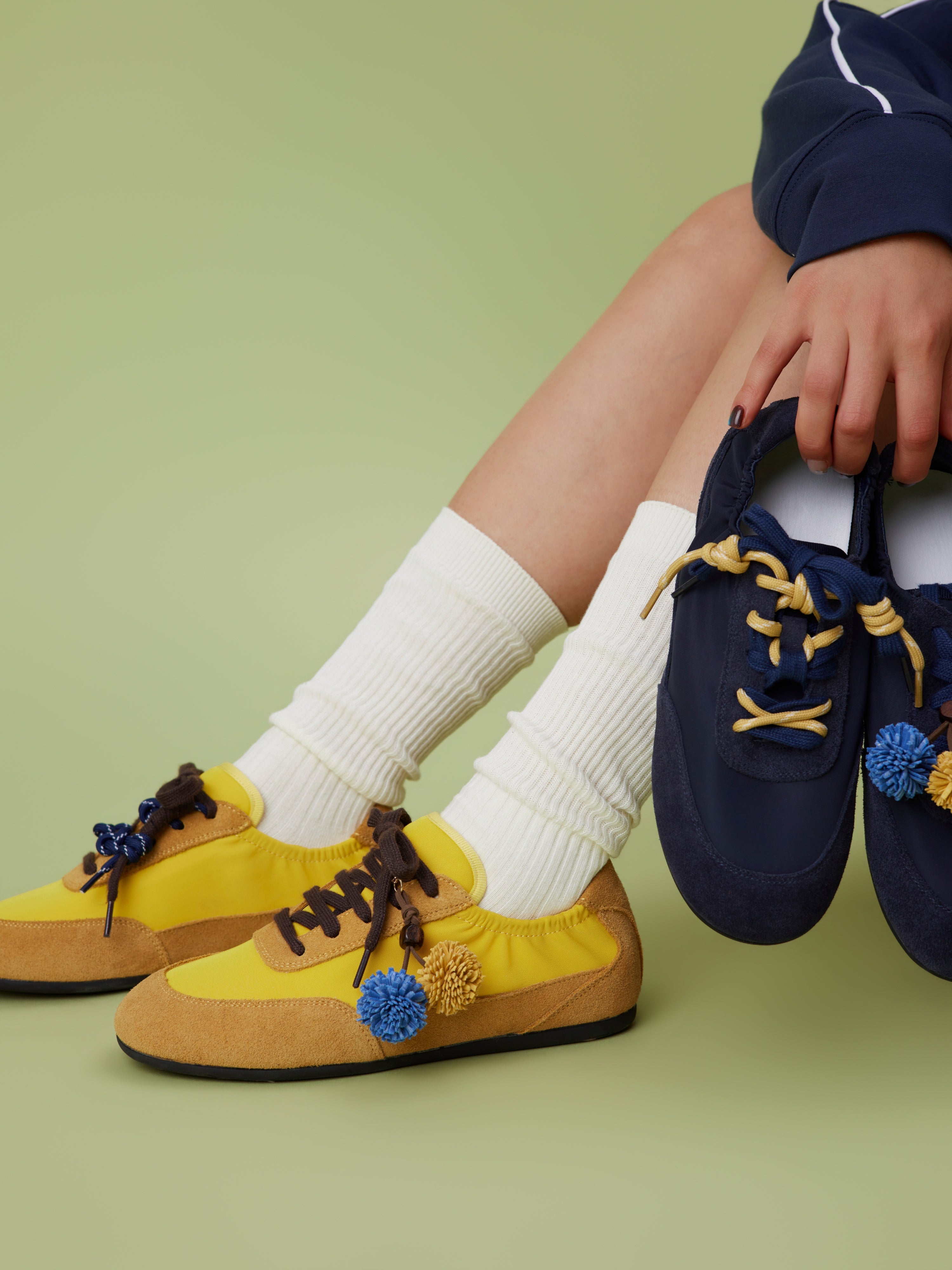 Contrasting Accents: Dark chocolate brown laces provide a sharp visual break against the warm yellow and ochre tones.
