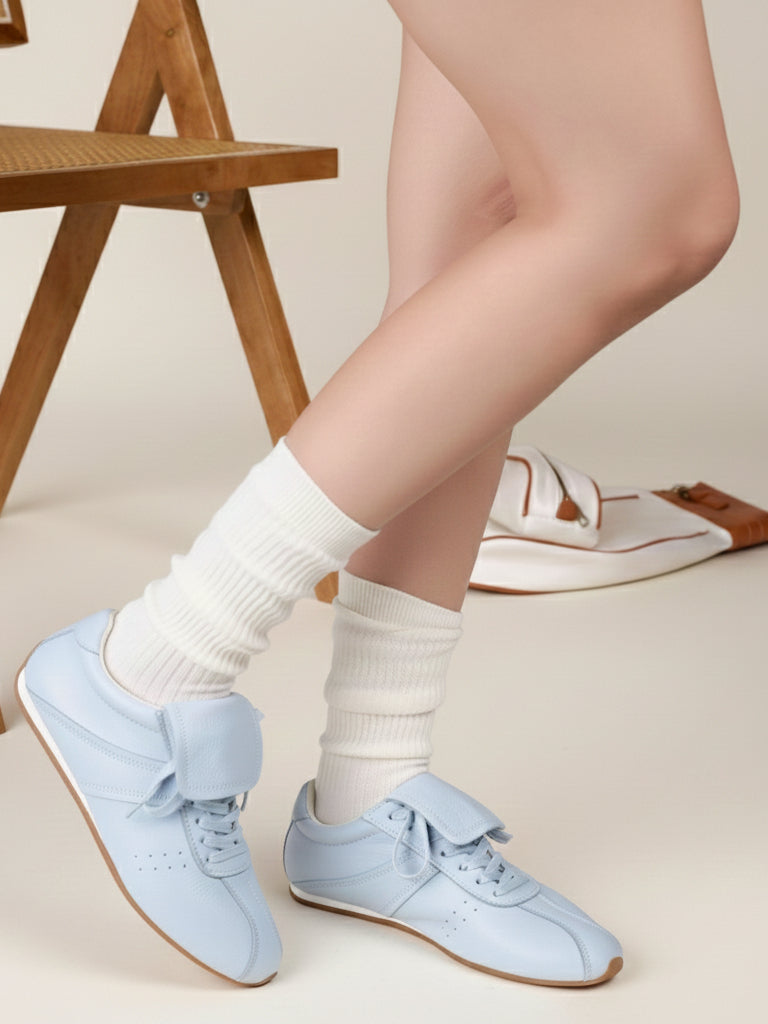 Discover the perfect blend of athletic charm and daily comfort with these soft blue leather sneakers. Featuring a unique fold-over tongue and a sleek, low-profile silhouette, these shoes offer a modern twist on classic retro trainers.