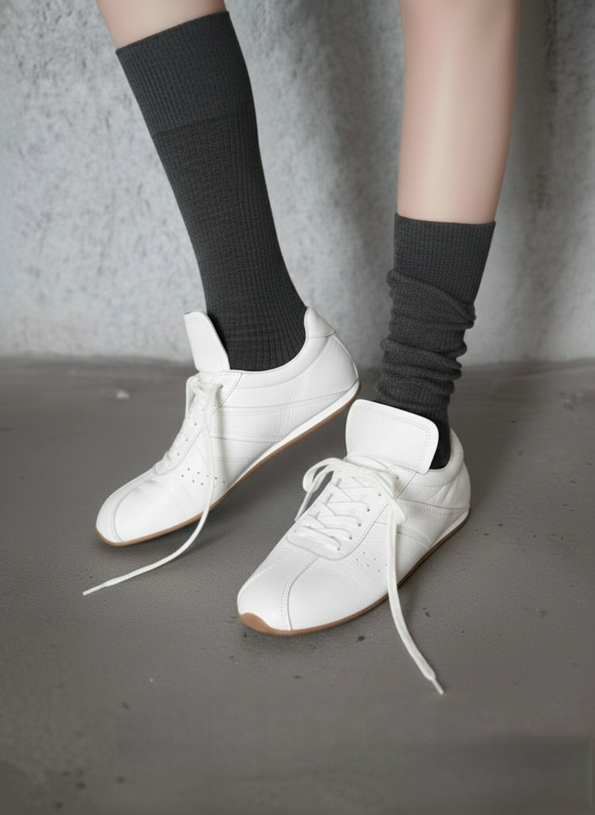 Discover the perfect blend of athletic charm and daily comfort with these soft white leather sneakers. Featuring a unique fold-over tongue and a sleek, low-profile silhouette, these shoes offer a modern twist on classic retro trainers.