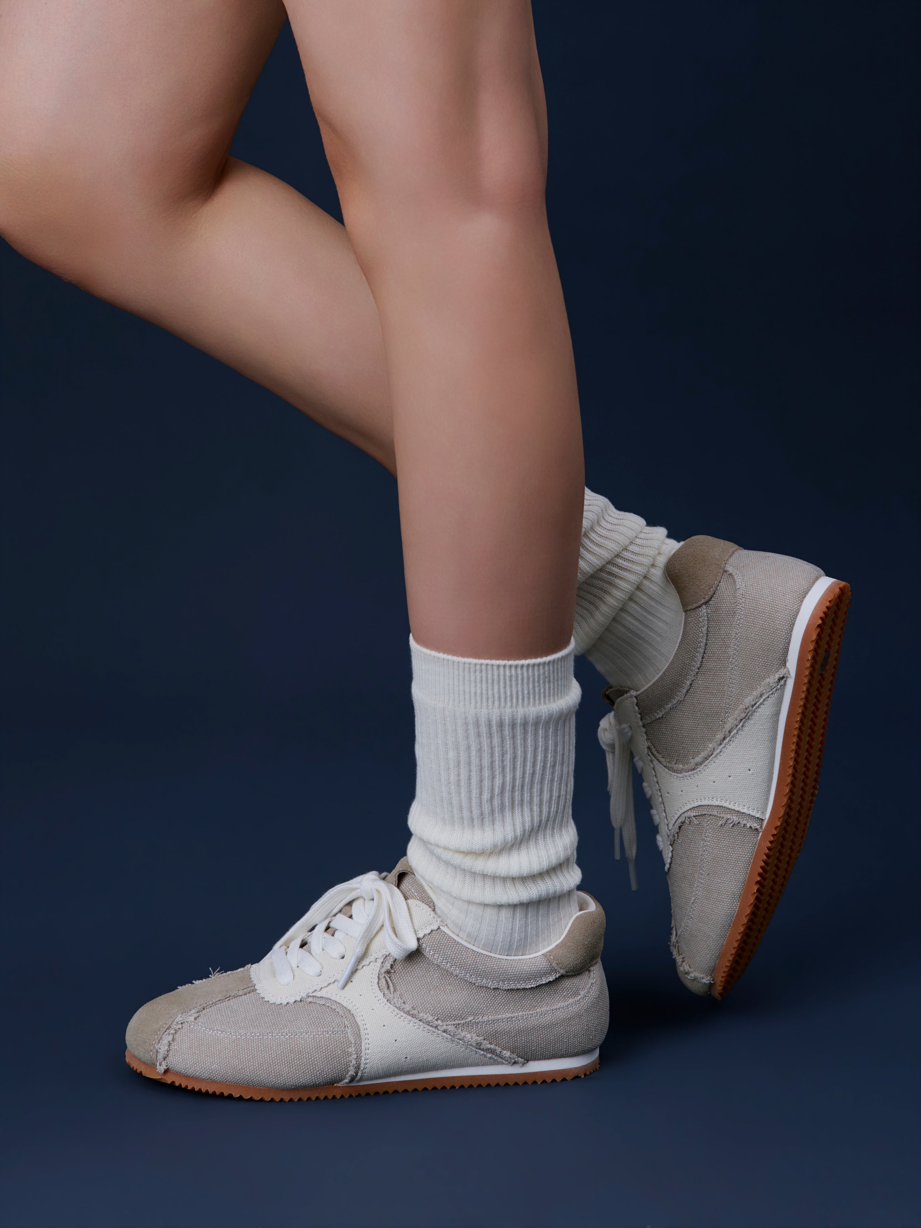 Vintage Gum Outsole: Built on a thin, honey-colored gum rubber sole with a serrated tread pattern, offering a retro track-shoe aesthetic.