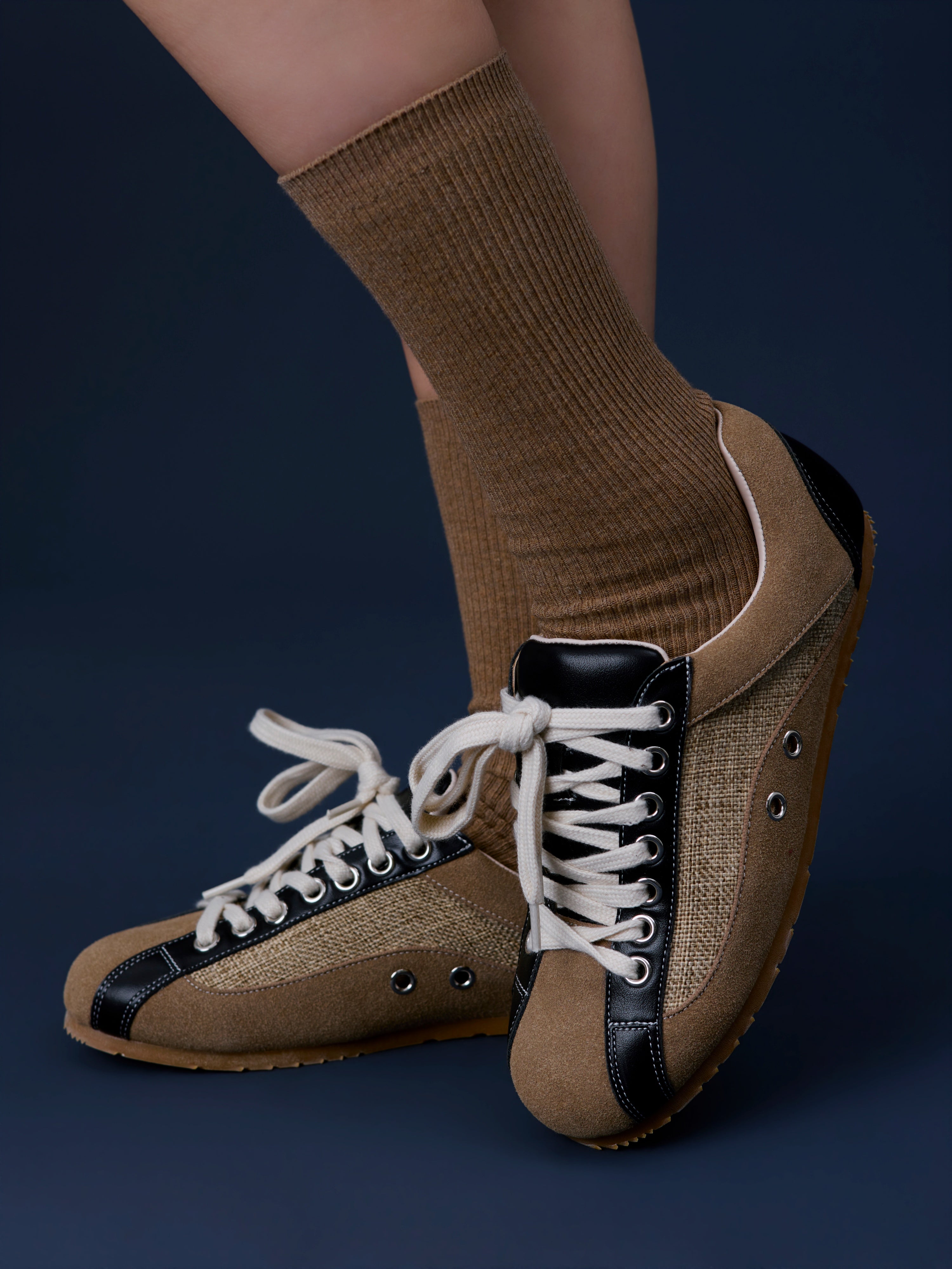Multi-Material Upper: Combines soft tan suede overlays with a coarse-woven textile body for a high-contrast, tactile look.
