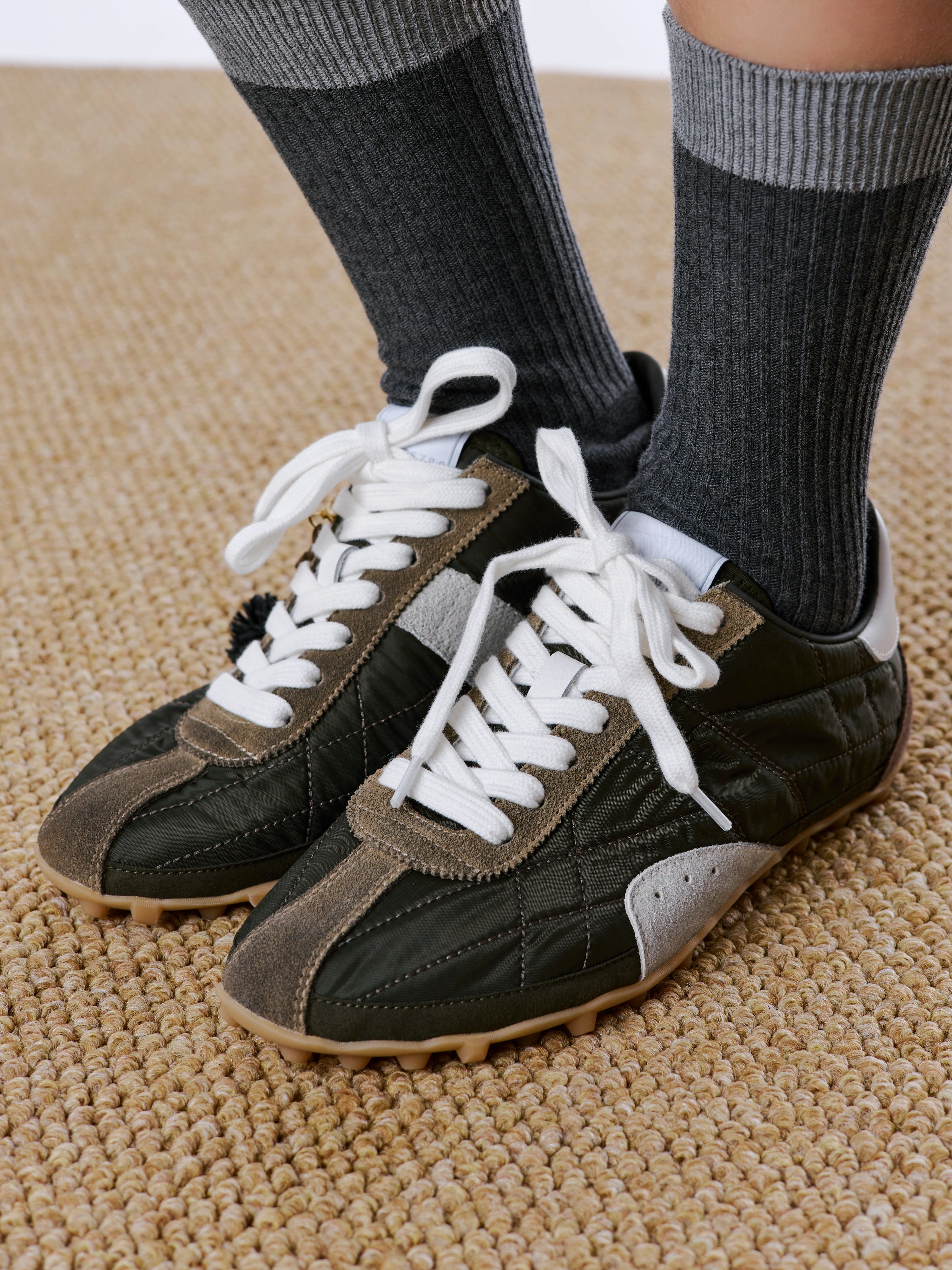These low-top sneakers combine retro track inspiration with high-performance materials and a refined color palette. Featuring a unique quilted texture and a high-traction sole, these trainers are designed for those who value both technical functionality and distinctive style.